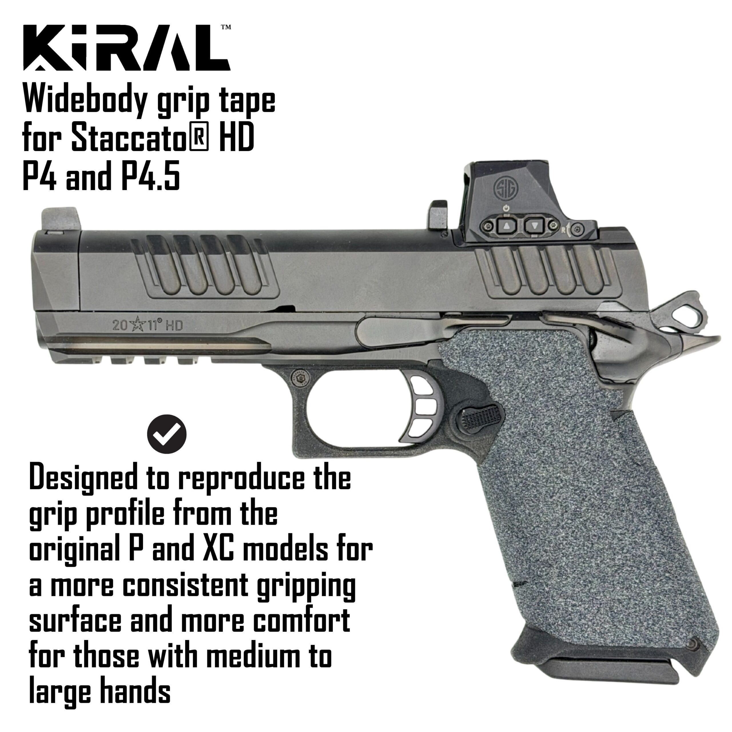 The Kiral Defense Widebody Grip Tape for Staccato® 2011® HD P4 and P4.5 offers users with medium and large hands the ability to adjust the pistol grip profile to match the original Staccato® P / XC and most other double-stack 1911 pistols, dramatically improve traction in wet and dry conditions, and help deaden the recoil impulse of the HD pistol series.